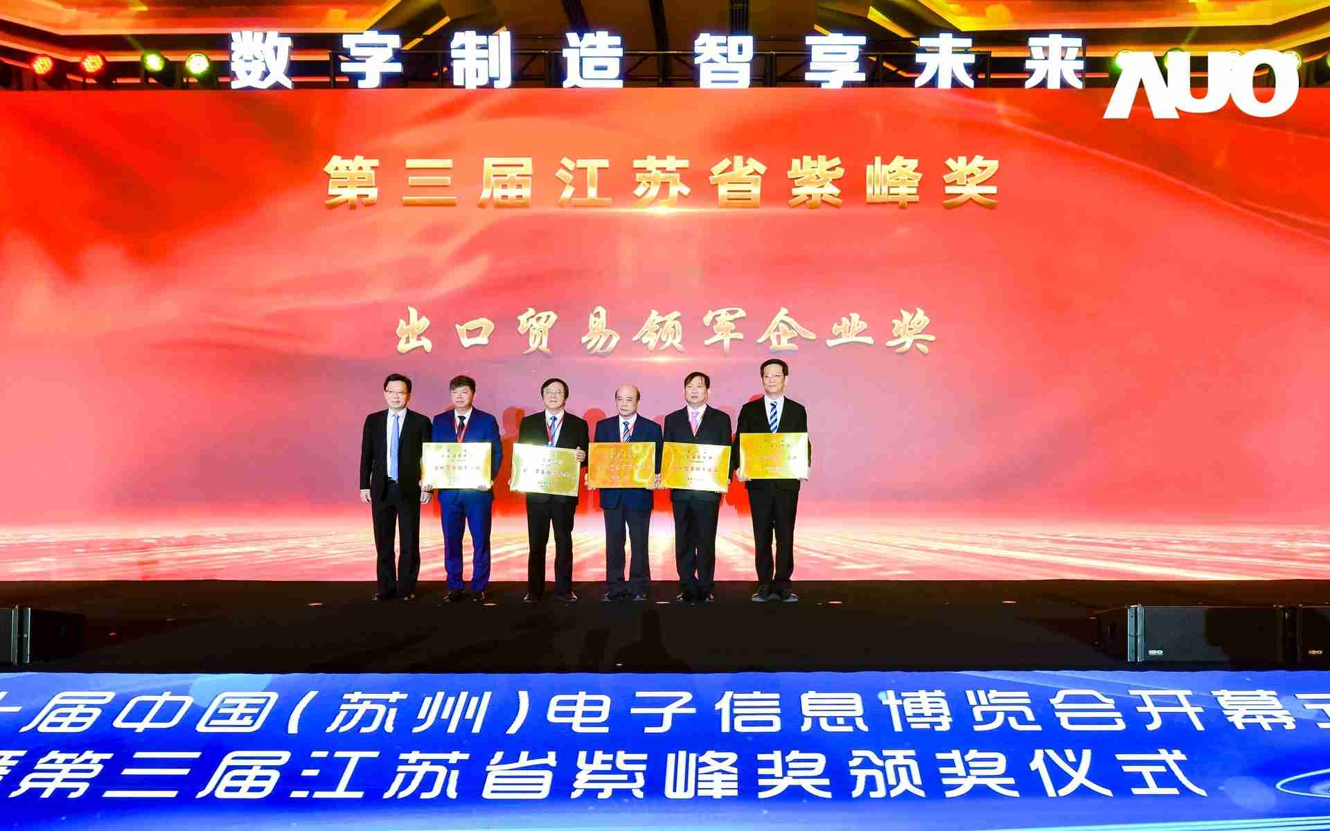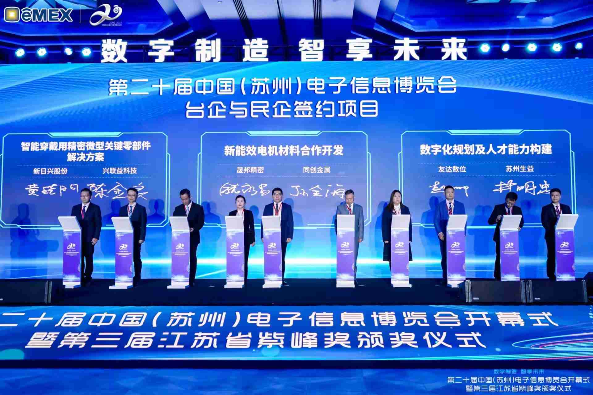 电博会开幕式当天也是第三届江苏省紫峰奖颁奖仪式,,省台办、、、、工信厅、、、商务厅、、、、苏州市相关领导均出席并颁奖。。该奖项为表彰对江苏高质量发展做出积极贡献的在苏企业,,,由江苏省政府专门设立。。。MG电玩光电 (苏州) 总经理郭振明代表上台领奖,,,,这也是MG电玩苏州连续三次蝉联紫峰奖 出口贸易领军企业奖。。MG电玩数位总经理赵丽娜女士,,也参与本次开幕式,,,,上台为本地化赋能签署战略合作协议,,将优质服务资源集合、、、下沉到更多细分行业,,为更多地区的制造企业提供数字化转型服务。。。。