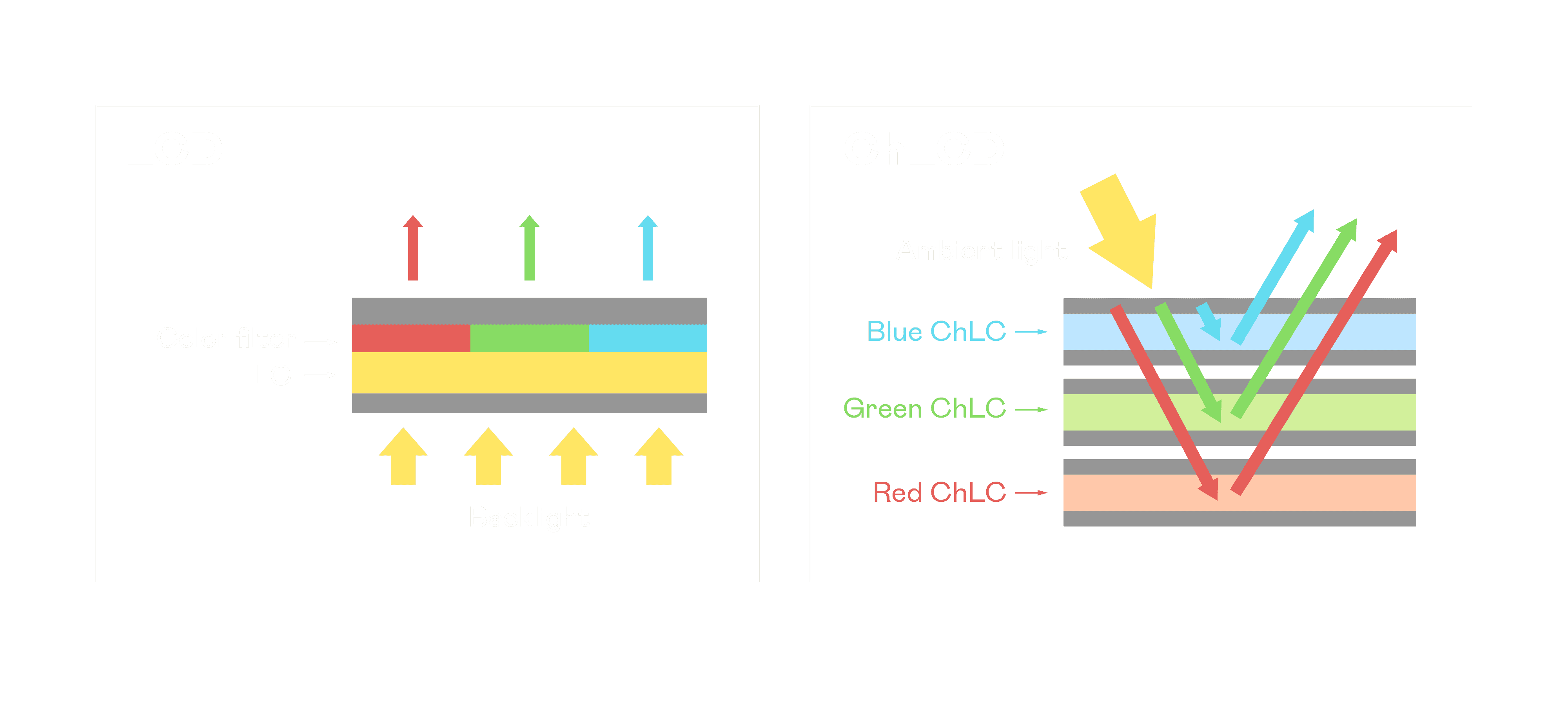 ChLCD 胆固醇液晶就如同纸张一样,,,,透过反射环境光来显示影像,,,因此长时间观看不易造成人眼视觉疲劳,,,,可达到护眼效果。。。当处于户外阳光下使用,,,,LCD 影像容易失真而不易观看,,但胆固醇液晶仍可维持较佳的影像品质。。。