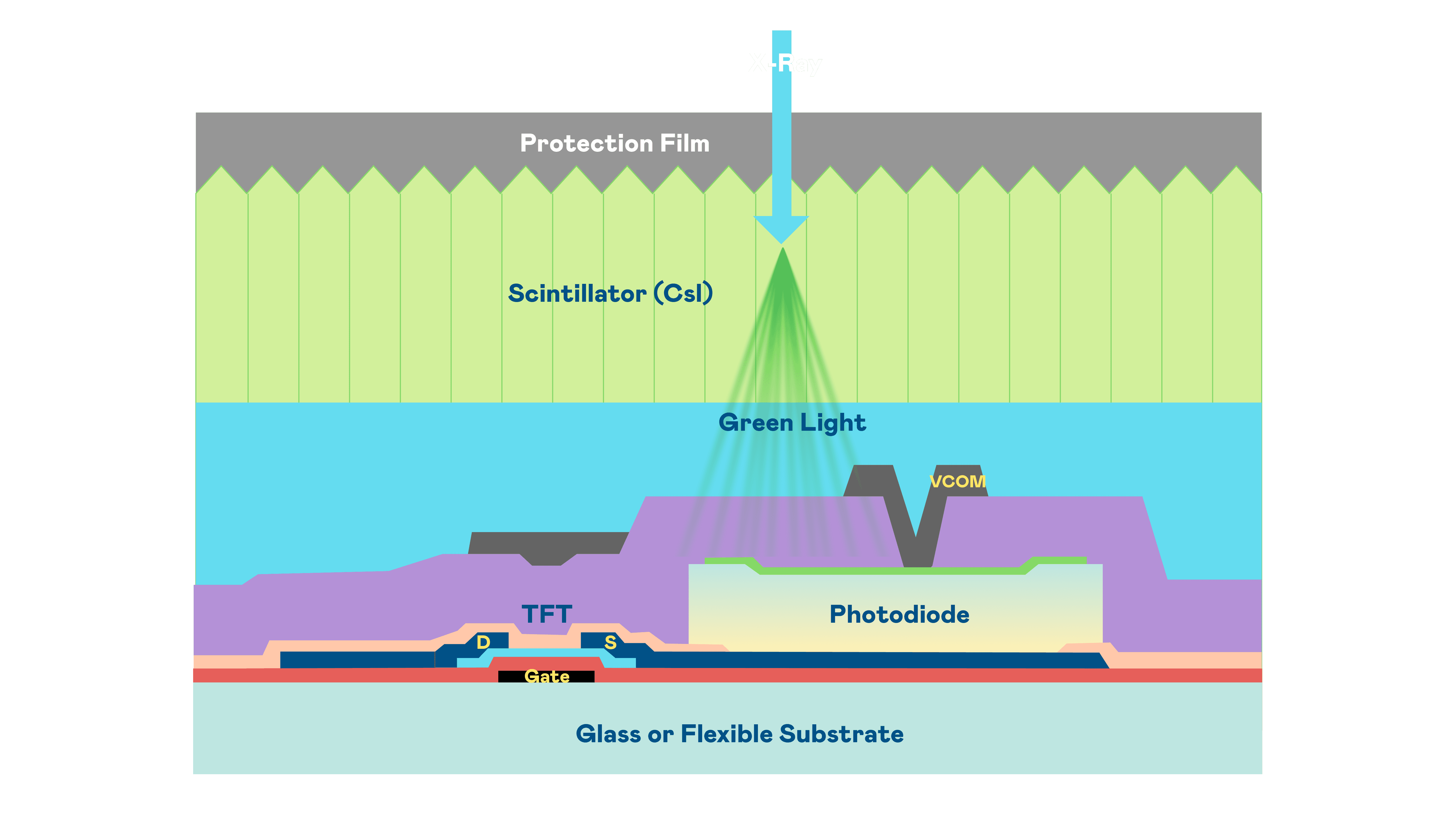 MG电玩的X光影像感测阵列使用薄膜电晶体 (TFT) 作为每个像素的读取开关,,搭配光电二极体(Photodiode)的光电转换元件,,用以感测X光影像讯号。。
